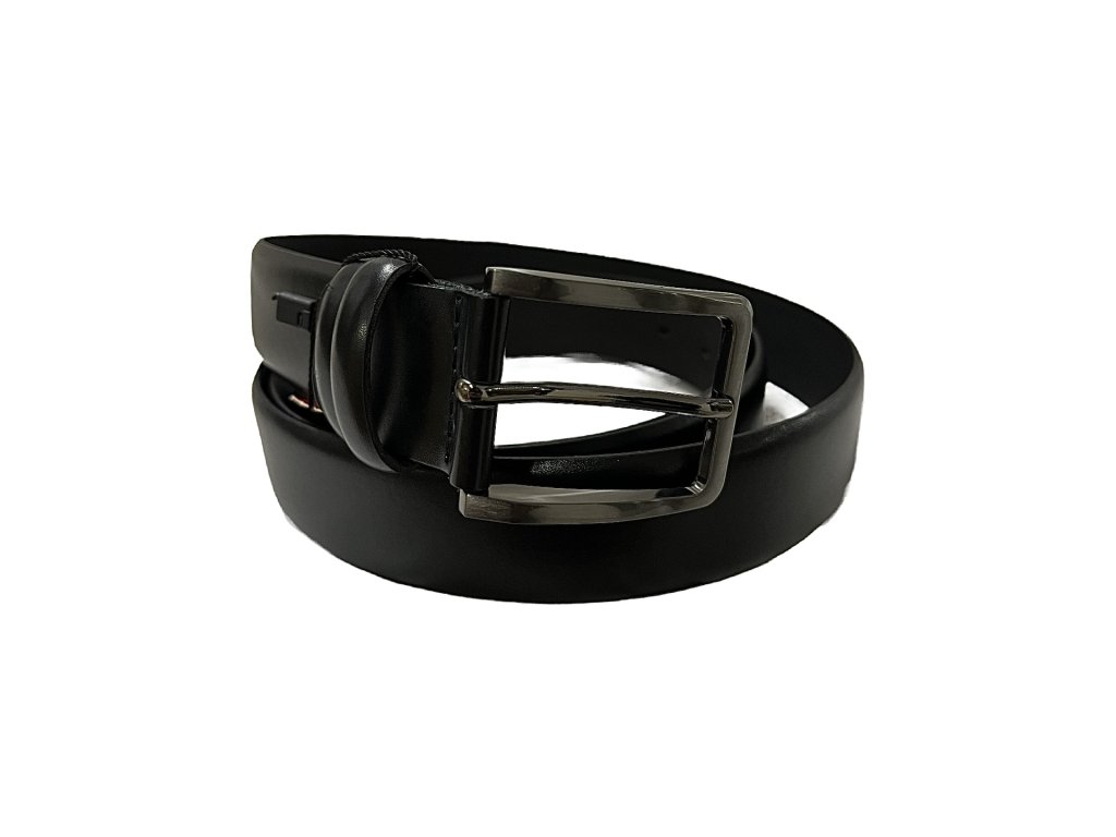 Pánsky klasický čierny opasok s striebornou-matnou prackou.